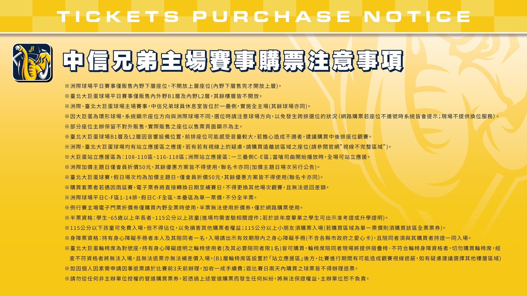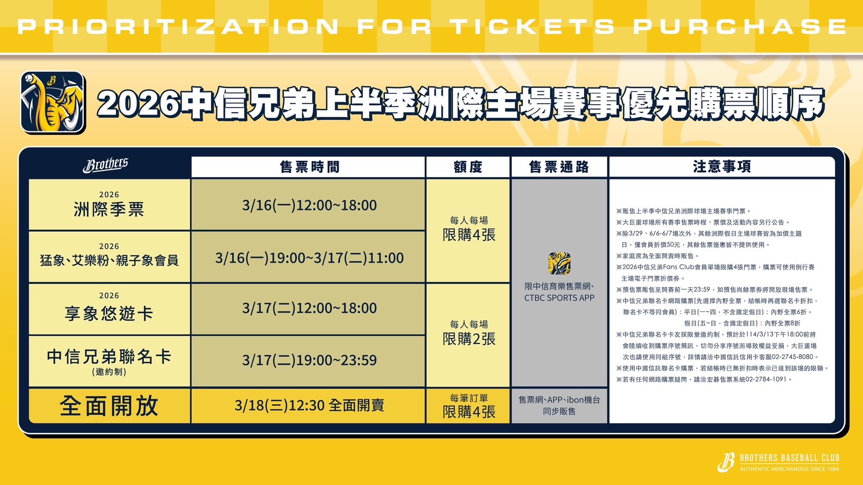 此外,中信兄弟球團今天也公告中華職棒37年上半季臺中洲際棒球場售票將於3/16(一)12:00在「中信育樂售票網」、「CTBC SPORTS APP」開放2026洲際季票會員優先購票,19:00開放2026猛象會、艾樂粉會、親子象會會員優先購票,3/17(二)12:00起享象悠遊卡會員優先購買,19:00中信兄弟聯名卡(邀約制)優先購票,3/18(三)12:30於「中信育樂售票網」、「CTBC SPORTS APP」及「7-11 ibon售票機台」全面開放購票!
