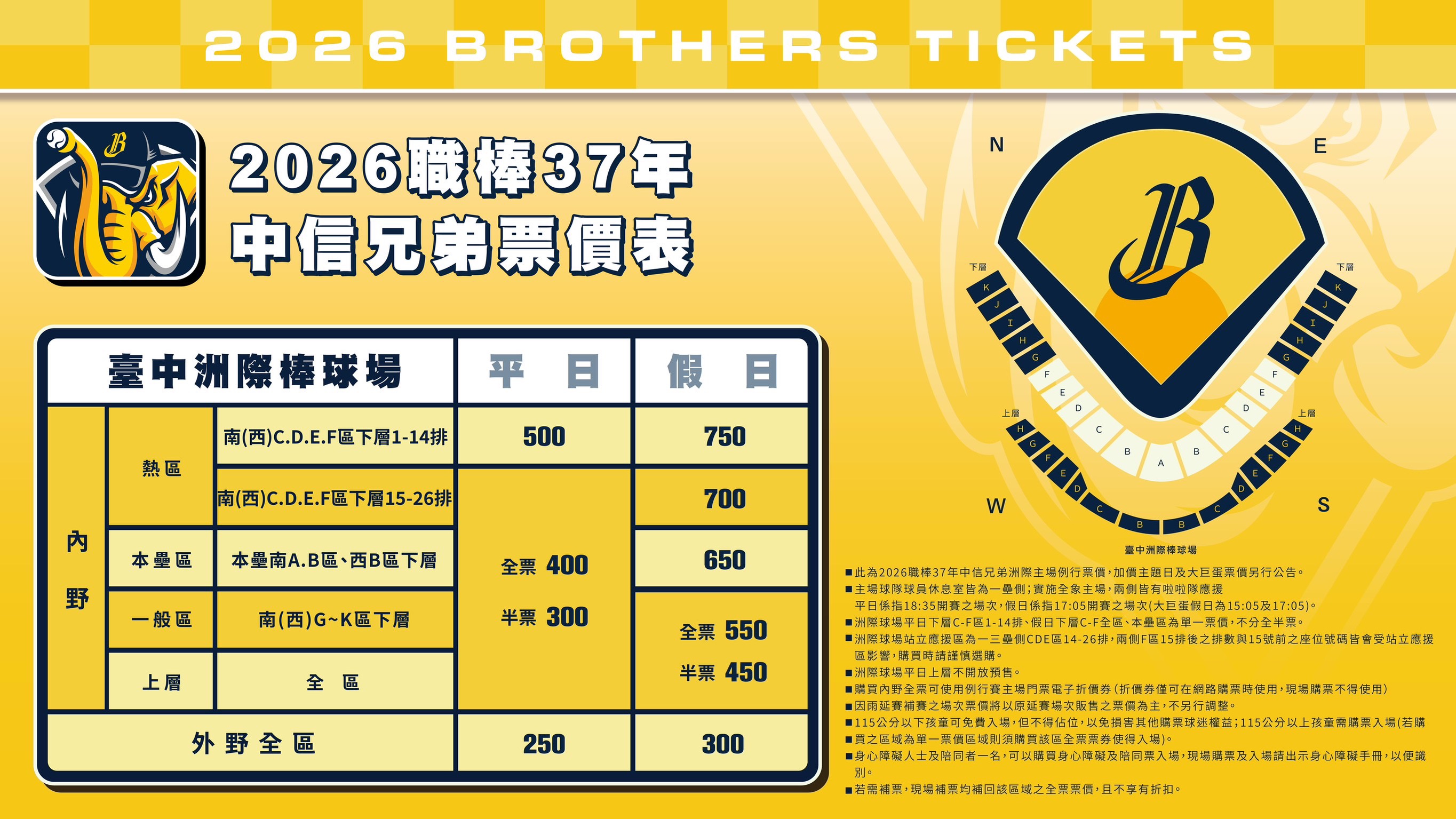 針對不同主題日,球團公佈詳細分區票價。【一般場次(平日/假日)】:內野熱區平日 500 元、假日最高 750 元。【特殊主題日(巧虎、我不是歌手、巨人聯名等)】:內野本後 AB 區:全票 700 元;內野熱區(C-F 區 1-14 排):全票 800-900 元(視主題內容調整);內野一般區(G-K 區/上層):全票 600 元;外野全區:一律 300 元。