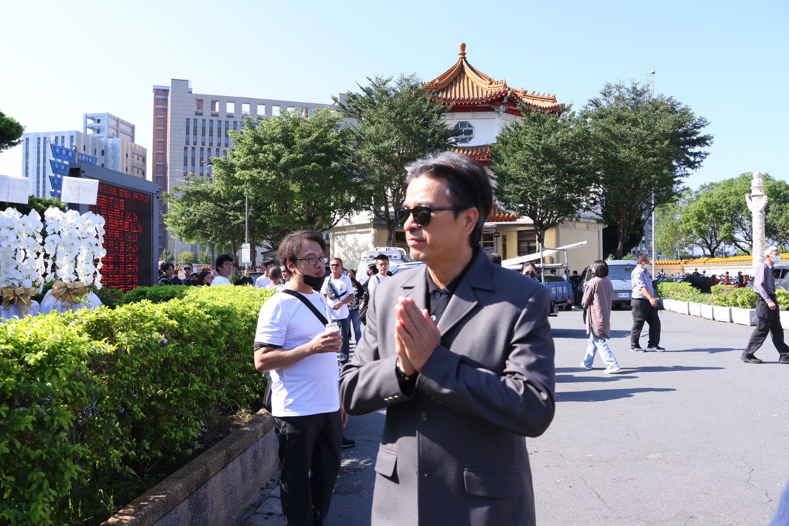 顏正國告別式,現場以花牆佈置寫上「殺青宴」,送別他人生最後一程。(圖/王人傑攝)