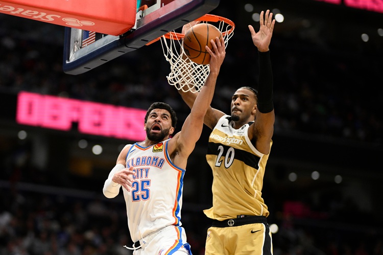 奧克拉荷馬雷霆後衛Ajay Mitchell和華盛頓巫師前鋒Justin Champagnie,因為在美國時間週六晚間雷霆以 132比111 戰勝巫師的比賽上半...