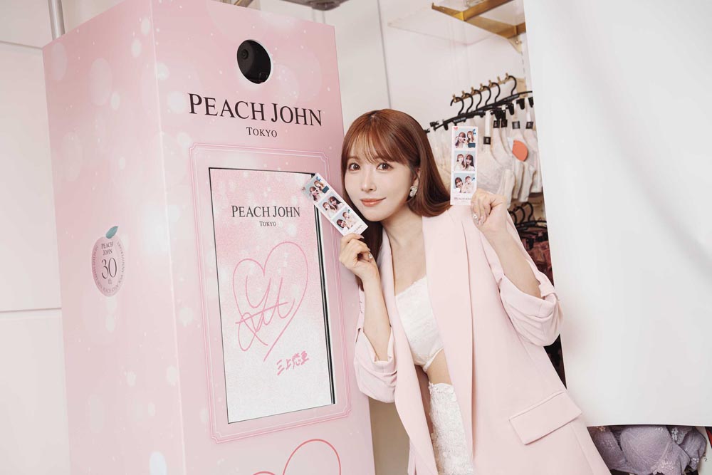她身穿「平口不走光系列台灣限定升級版」內衣,為品牌攝六組美照慶祝30週年,三上悠亞在記者會現場也特別分享自己的心情,三上悠亞說:「我從學生時期就開始喜歡PEACH JOHN,所以非常開心這次能參加30週年的慶祝活動,穿著喜歡的內衣、來到喜歡的土地、和喜歡我的粉絲朋友們見面,對我來說真的非常有意義,也希望台灣的粉絲朋友們喜歡這次為大家準備的作品,一定要和我一起支持PEACH JOHN!」