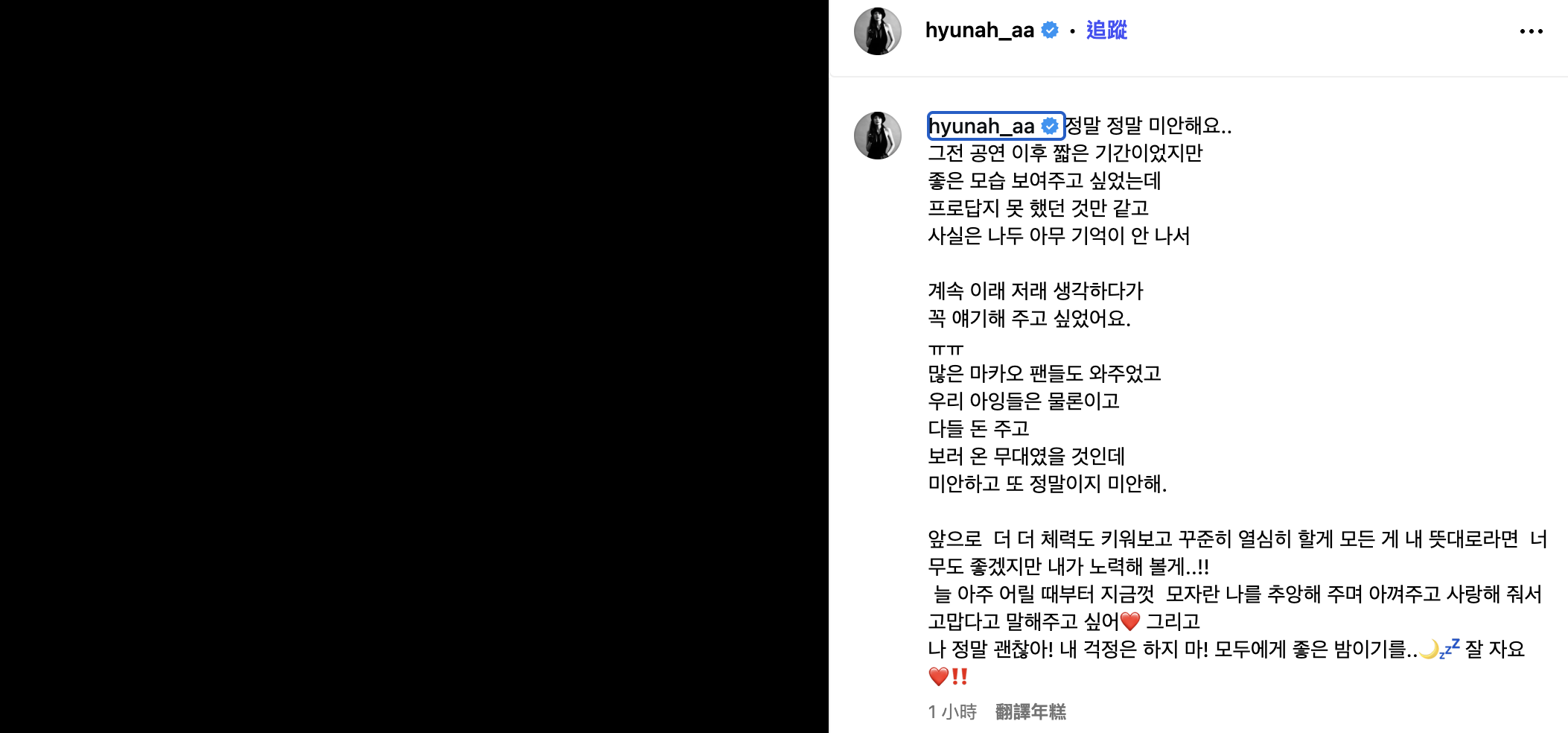 泫雅稍早則透過IG報平安,「真的真的很抱歉,雖然離上次公演時間很短,但我真的很想展現出好的模樣,卻沒有表現出專業的樣子,事實上我什麼也都不記得了。」並強調自己未來會再多訓練體能,最後也不望向粉絲喊話:「我真的沒事!不用擔心我,祝大家有個美好的夜晚,晚安喔!」